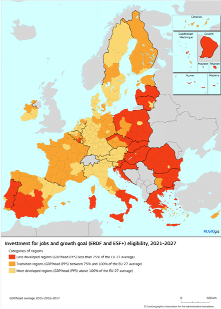 This is the case, for instance, of I3 – Interregional Innovation Investment Instrument, funded by the European Regional Development Fund (ERDF). Calls within such programme are topic-oriented (manufacturing, green, or digital) and applicants can submit their proposals in consortia of 3 to 5 partners. Only requirement: project partners should be based in regions whose levels of development diverge (see figure).