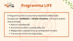 Il programma LIFE dell’Unione Europea è uno strumento di finanziamento dedicato ai progetti ambientali e climatici. Lanciato nel 1992, LIFE mira a contribuire alla transizione verso un’economia sostenibile, circolare ed efficiente sotto il profilo delle risorse, alla protezione dell’ambiente e alla mitigazione dei cambiamenti climatici.